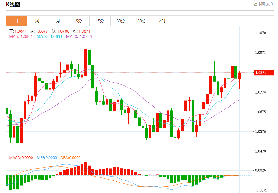 周一晚间,美元指数现报102.352,跌幅0.23%,现对美元兑欧元、英镑、日元主要货币对分析表述如下: 欧元/美元 汇价高见1.0878,低见1.0788。上一交易日,汇价收于1.0842。 基本面:意大利央行行长表示,欧洲央行加息导致意大利央行负债成本迅速增加,未来几年意央行与欧洲央