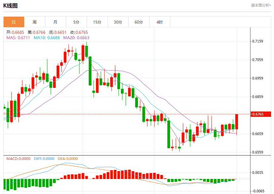 今日周一,澳元兑美元报0.6766,涨幅1.19%;美元兑加元报1.3474,跌幅0.31%;美元兑瑞郎报0.9152,跌幅0.02%。 澳元兑美元汇率分析 技术点评:RI技术指标看涨,有进一步向上趋势。 阻力位:0.69200.68800.6800 支撑位:0.66500.65900.6560 美元兑