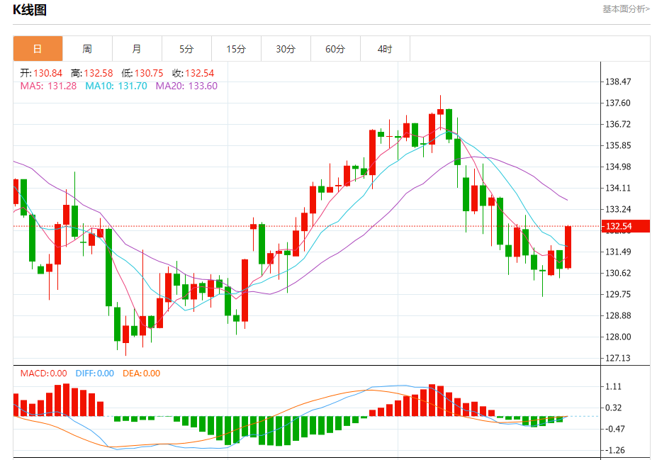周三盘中,美元/日元报132.61,涨幅1.37%。 今日分析:在131.40之上,看涨,目标价位为132.25,然后为132.50。 技术点评:RI技术指标向上运行。 支撑位:131.40131.20130.95 阻力位:132.75132.50132.25 (亚汇网编辑:冰凡)