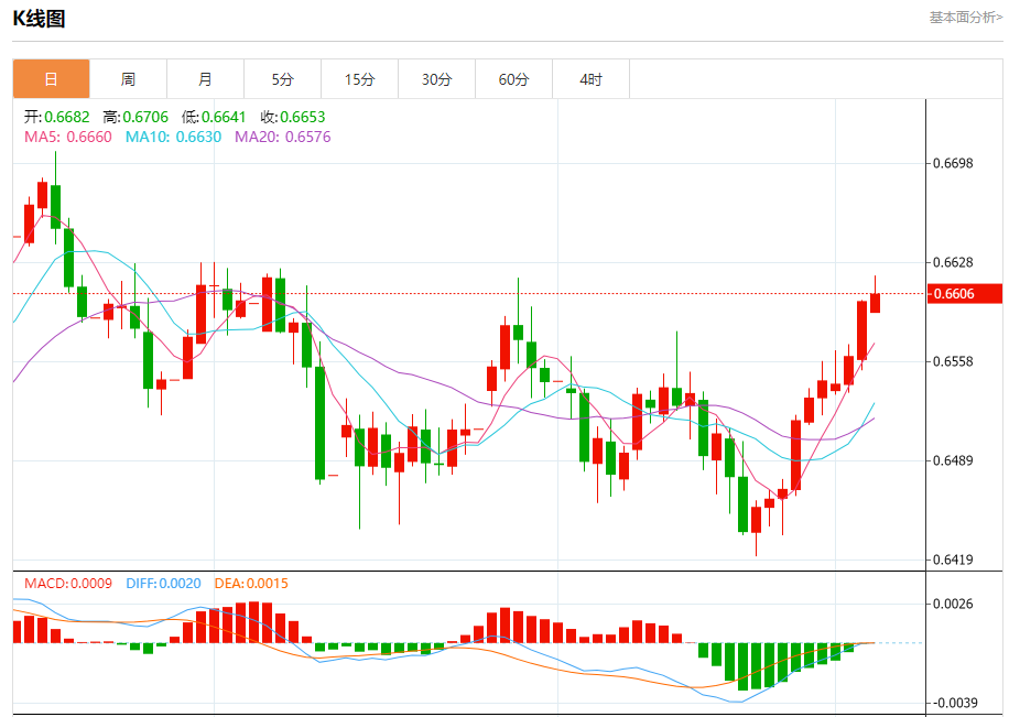 今日周四,澳元兑美元报0.6607,涨幅0.08%;美元兑加元报1.3976,涨幅0.18%;美元兑瑞郎报0.8006,涨幅0.16%。 澳元兑美元汇率分析 技术点评:RI技术指标运行趋势复杂,倾向于上涨。 阻力位:0.66600.66450.6630 支撑位:0.65850.65700.6555 美元