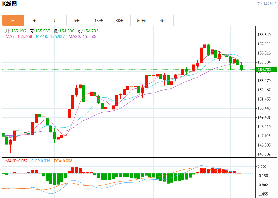 周四盘中,美元/日元报154.674,跌幅0.34%。 今日分析:在155.10之下,看跌,目标价位为154.15,然后为153.70。 技术点评:RI技术指标上,呈现新的下降趋势。 支撑位:154.15153.70153.05 阻力位:156.05155.50155.10 (亚汇网编辑:冰凡)