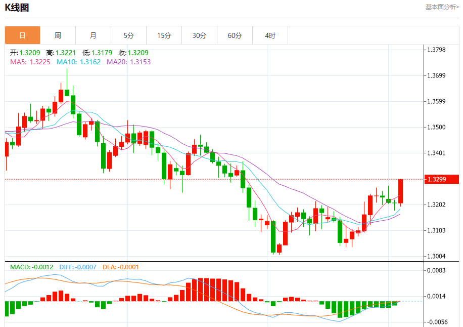 周三盘中,英镑/美元报1.3299,涨幅0.67%。 今日分析:在1.3230之上,看涨,目标价位为1.3310,然后为1.3365。 技术点评:RI技术指标看涨,有进一步向上趋势。 支撑位:1.32301.32001.3175 阻力位:1.34001.33651.3310 (亚汇网编辑:冰凡)