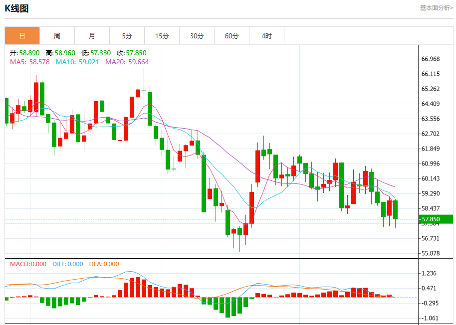 周二盘中,WTI原油报57.840,跌幅1.67%。 今日分析:在58.20之上,看涨,目标价位为59.05,然后为59.50。 技术点评:随后的阻力位是59.05,然后为59.50。 支撑位:58.2057.8057.40 阻力位:60.1059.5059.05 (亚汇网编辑:冰凡)
