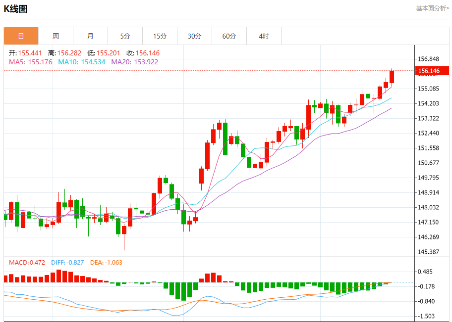 周三盘中,美元/日元报156.234,涨幅0.49%。 今日分析:在155.20之上,看涨,目标价位为156.25,然后为156.80。 技术点评:即使我们不能排除持续技术反弹的可能性,其时间长度上,应该是有限的。 支撑位:155.20154.85154.60 阻力位:157.50156.80156.25