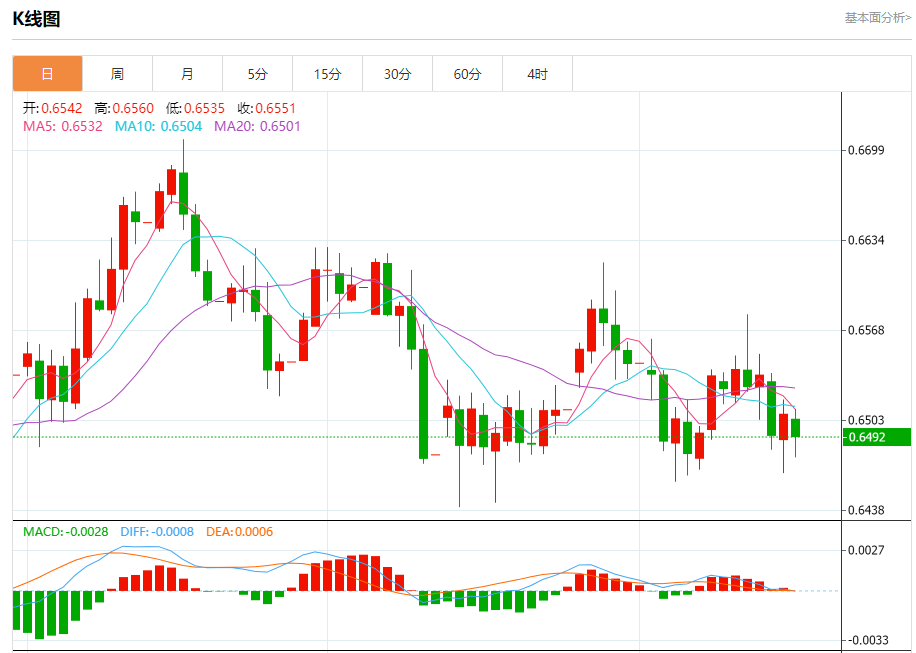 今日周三,澳元兑美元报0.6492,跌幅0.25%;美元兑加元报1.4005,涨幅0.11%;美元兑瑞郎报0.8018,涨幅0.29%。 澳元兑美元汇率分析 技术点评:只要依旧存在0.6505阻力位,很可能下跌至0.6465。 阻力位:0.65350.65200.6505 支撑位:0.64650.64450.6425