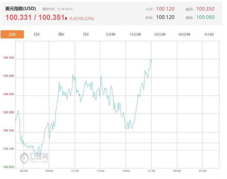 周四(11月20日)亚洲时段,美元指数持稳100关口上方继续走高,今日美元指数最新报100.26,涨幅0.14%,美元指数在连续三日上涨后企稳,由于美联储12月降息的可能性降低,美元可能进一步走强。芝商所(C)的FdWatch工具显示,市场目前预期美联储在12月会议上降息25个基点的概率为49%,低于一周前的63%。