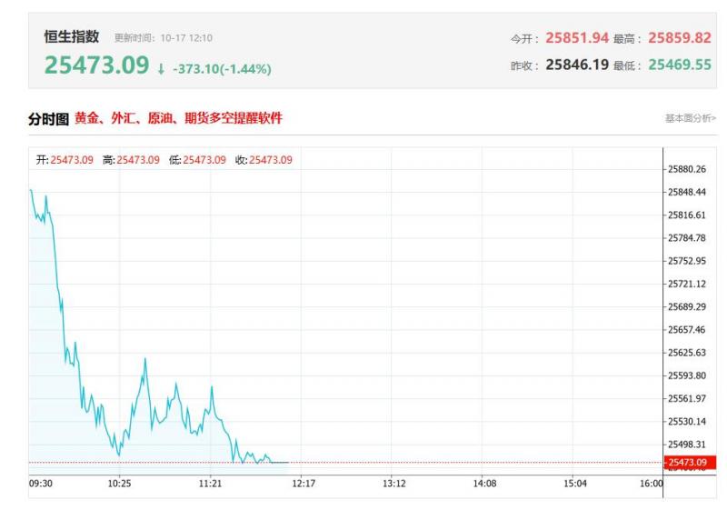 上午盘面: 港股上午盘三大指数再度下挫,恒生科技指数跌幅最大,午间收跌2.81%失守6000点且刷新近期调整新低,恒生指数、国企指数分别下跌1.61%及1.67%,恒指跌超400点报25472点,市场情绪表现低迷。盘面上,作为市场风向标的大型科技股集体走低大市承压明显,其中,百度跌3.48%,阿里巴巴跌3.16%,