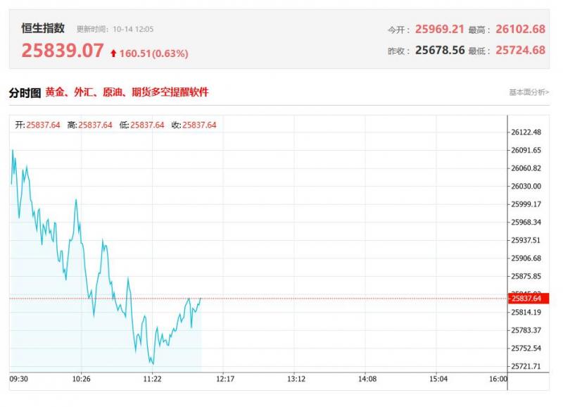 上午盘面: 港股上午盘三大指数高开震荡,皆迎来反弹行情。截止午盘,恒生指数涨1.21%,国企指数涨1.11%,恒生科技指数涨1.18%,均止步连跌行情,市场情绪稍有回暖。盘面上,作为市场风向标的大型科技股集体上涨,其中,阿里巴巴涨近3%,京东、小米涨超1%,腾讯、百度、美团、网易、快手涨幅在1%以内