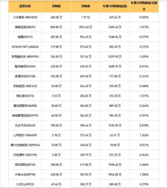 10月14日港股回购概况: 中国恒有源集团(08128)、摩比发展(00947)、方正控股(00418)、永安国际(00289)、天福(06868)、信利国际(00732)、VITAOYIT'L(00345)、心玮医疗-(06609)、酷派集团(02369)、首佳科技(00103)、清科创业(01945)、碧桂园服务(06098)、创新奇智(02121)、