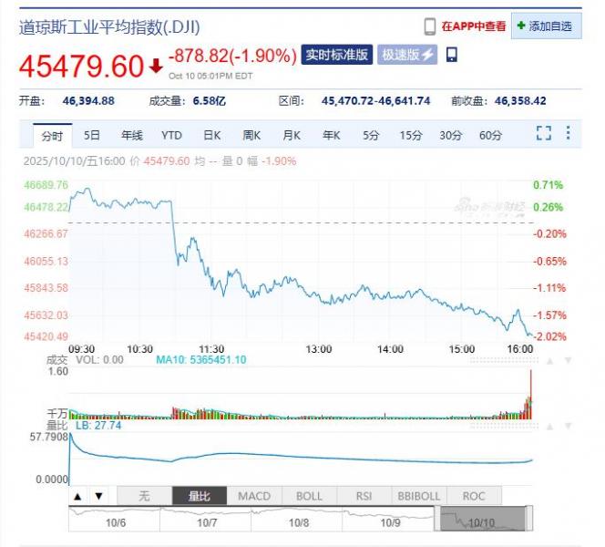 2025年10月13日星期一,以下是由亚汇网整理的昨夜今晨国际财经要闻汇总: 国际股市 一、美股股市:道指跌878.82点,跌幅为1.90%,报45479.60点;纳指跌820.20点,跌幅为3.56%,报22204.43点;标普500指数跌182.59点,跌幅为2.71%,报6552.52点。纳指、标普500指数创4月10日以来最大单日