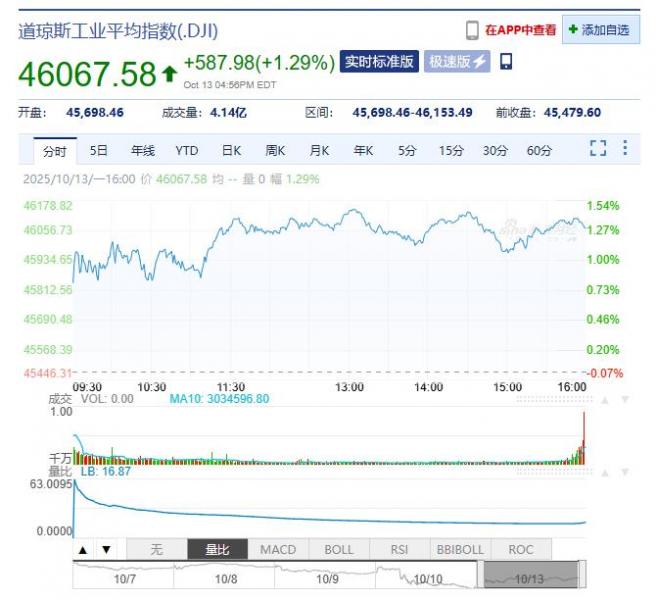 2025年10月14日星期二,以下是由亚汇网整理的昨夜今晨国际财经要闻汇总: 国际股市 一、美股股市:道指涨587.98点,涨幅为1.29%,报46067.58点;纳指涨490.178点,涨幅为2.21%,报22694.608点;标普500指数涨102.21点,涨幅为1.56%,报6654.72点。纳微半导体(VT.U)盘后涨幅扩大至42%