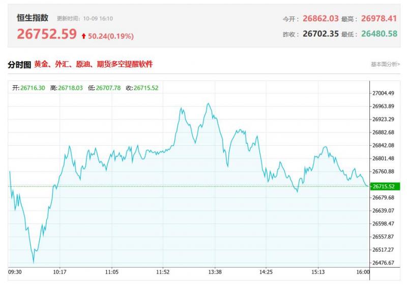 港股收盘行情: 香港恒生指数10月9日(周四)收盘下跌76.87点,跌幅0.29%,报26752.59点; 香港恒生科技指数10月9日(周四)收盘下跌42.85点,跌幅0.66%,报6471.34点; 国企指数10月9日(周四)收盘上涨6.26点,涨幅0.07%,报9530.13点; 红筹指数