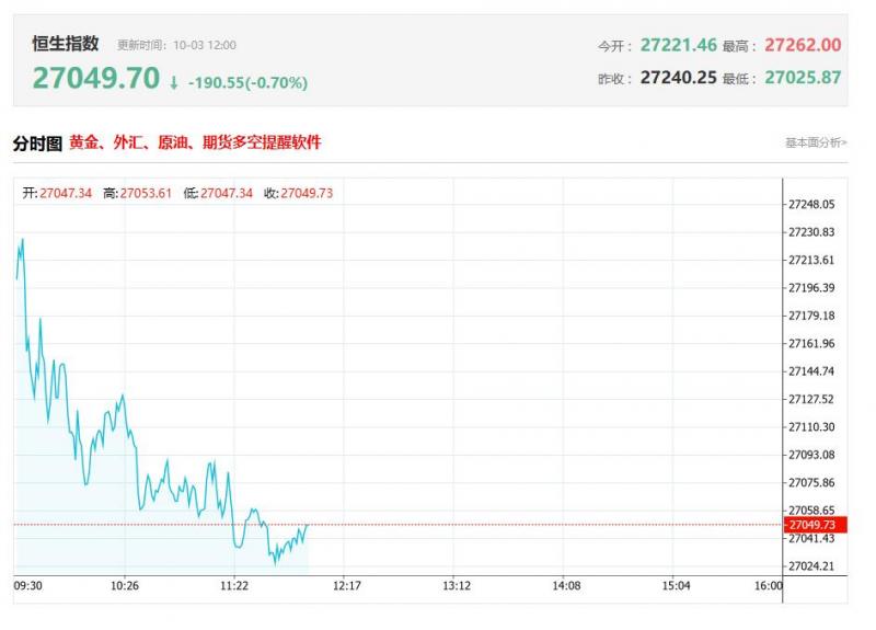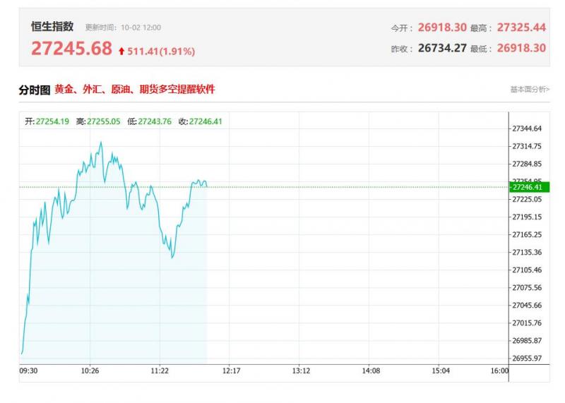 上午盘面: 港股承接假期前强势,第四季开局强势,尽管A股假期休市,买盘依然炽热。截至半日收盘,恒指涨1.45%升破27000点,恒生科技指数涨2.66%,国企指数涨1.63%。板块方面,科技股、锂电池、半导体、黄金股表现强势,内银股、内房股、新消费普跌。个股方面,阿里巴巴涨超4%创逾4年新高,获小摩大幅上