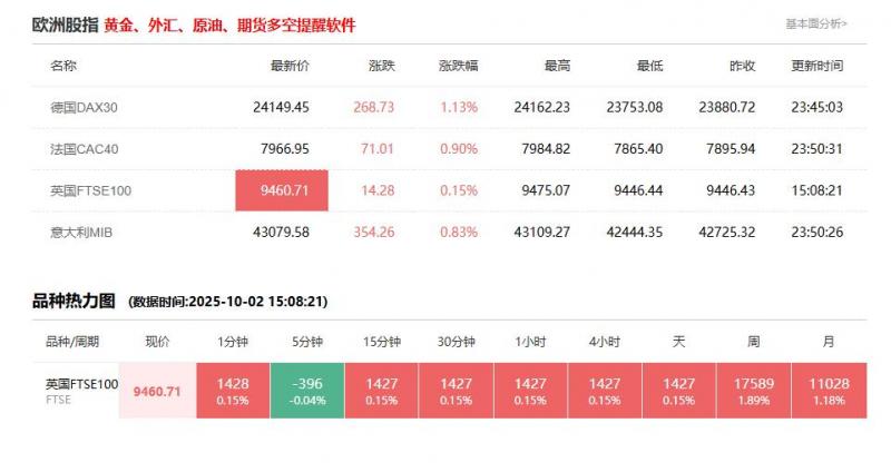 股市开盘: 德国DAX30指数10月2日(周四)开盘上涨125.05点,涨幅0.52%,报24274.50点; 英国富时100指数10月2日(周四)开盘上涨23.62点,涨幅0.25%,报9470.05点; 法国CAC40指数10月2日(周四)开盘上涨63.14点,涨幅0.79%,报8030.09点; 欧洲