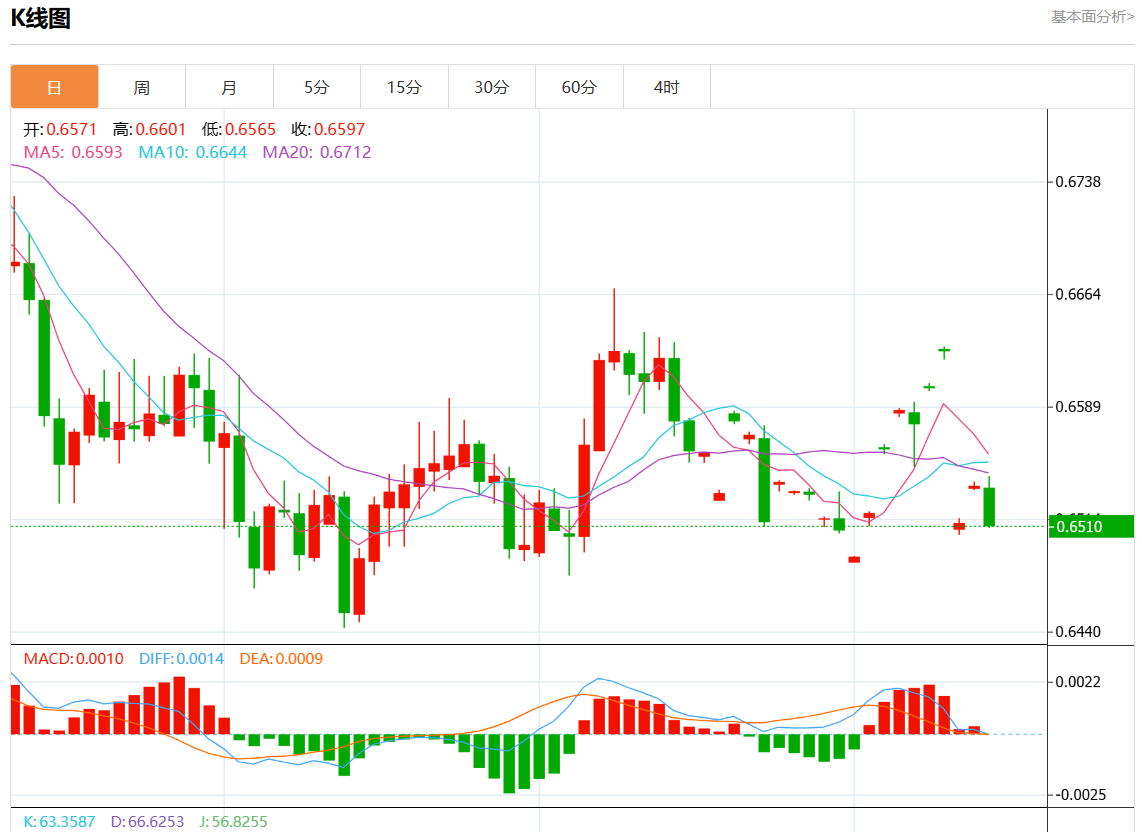 周五盘中,澳元/美元报0.6512,跌幅0.38%。 今日分析:在0.6505之上,看涨,目标价位为0.6555,然后为0.6580。 技术点评:RI技术指标缺乏下降动能。 支撑位:0.66000.65800.6555 阻力位:0.65050.64800.6460 (亚汇网编辑:静香)