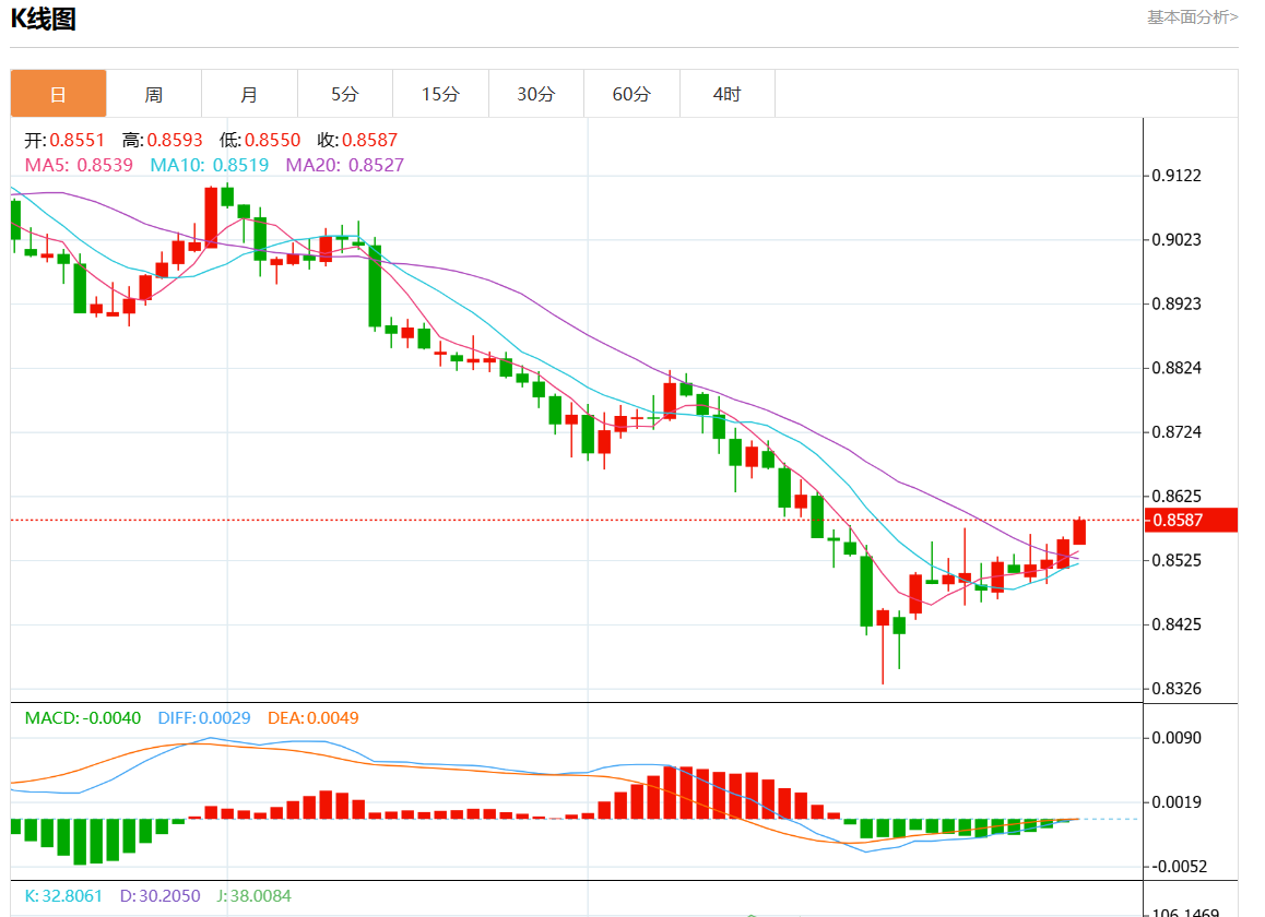 周二盘中,美元/瑞元报0.8585,涨幅0.33%。 今日分析:在0.8545之上,看涨,目标价位为0.8600,然后为0.8620。 技术点评:RI技术指标看涨,有进一步上升空间。 支撑位:0.86400.86200.8600 阻力位:0.85450.85200.8505 (亚汇网编辑:静香)