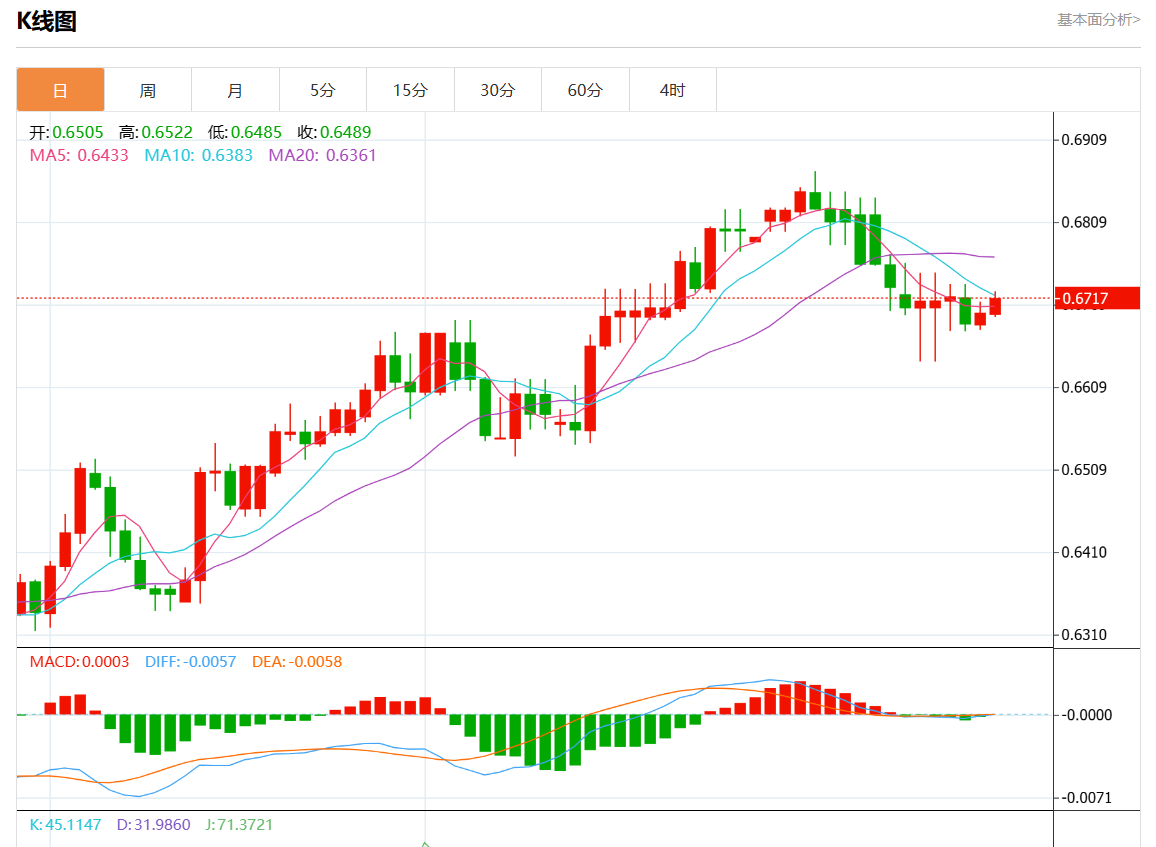 周四盘中,澳元/美元报0.6719,涨幅0.30%。 今日分析:在0.6700上方做多头,目标在0.6730和0.6745。 技术点评:RI涨跌互现。 支撑位:0.67600.67450.6730 阻力位:0.67000.66850.6675 (亚汇网编辑:静香)