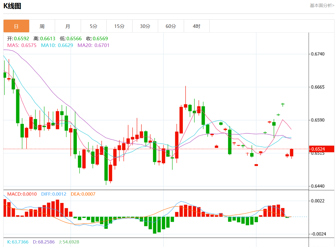 周四盘中,澳元/美元报0.6526,涨幅0.21%。 今日分析:在0.6540之下,看跌,目标价位为0.6490,然后为0.6470。 技术点评:上升的空间可能被0.6540阻力位所限制。 支撑位:0.66000.65700.6540 阻力位:0.64900.64700.6450 (亚汇网编辑:静香)