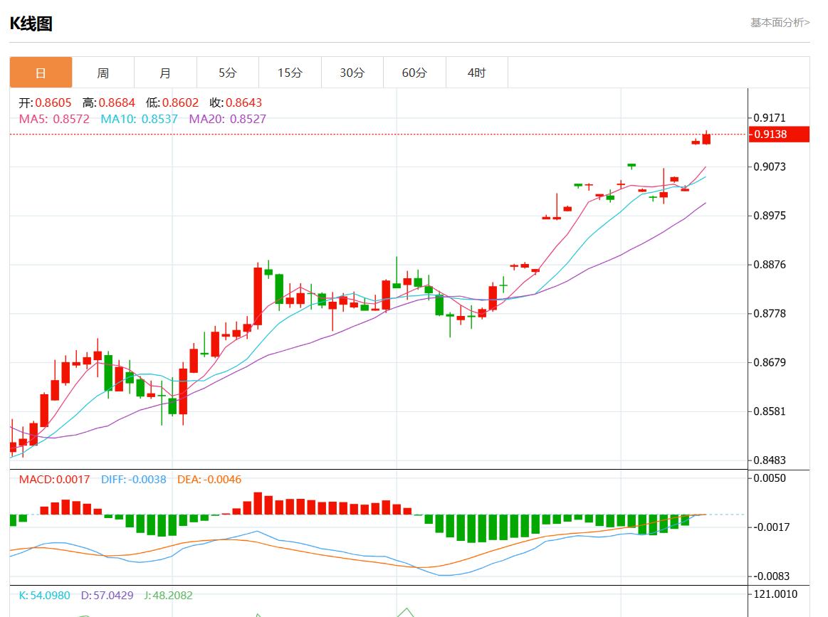 周四盘中,美元/瑞元报0.9138,涨幅0.11%。 今日分析:在0.9105之上,看涨,目标价位为0.9150,然后为0.9175。 技术点评:从技术角度上,RI技术指标在50%中性区域上方。 支撑位:0.92000.91750.9150 阻力位:0.91050.90850.9065 (亚汇网编辑:静