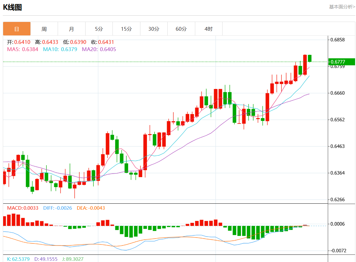 周五盘中,澳元/美元报0.6778,跌幅0.34%。 今日分析:在0.6765上方做多头,目标在0.6805和0.6830。 技术点评:盘中技术指标喜忧参半,需要谨慎。 支撑位:0.68450.68300.6805 阻力位:0.67650.67450.6725 (亚汇网编辑:静香)