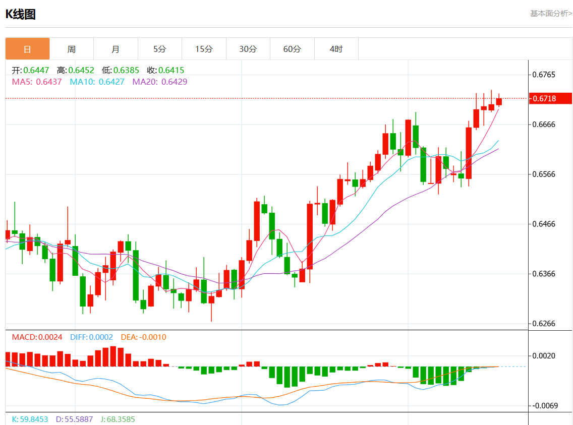 周一盘中,澳元/美元报0.6719,涨幅0.19%。 今日分析:在0.6735下方做空,目标在0.6685和0.6665。 技术点评:上行潜力可能受到阻力位0.6735的限制。 支撑位:0.68000.67700.6735 阻力位:0.66850.66650.6635 (亚汇网编辑:静香)