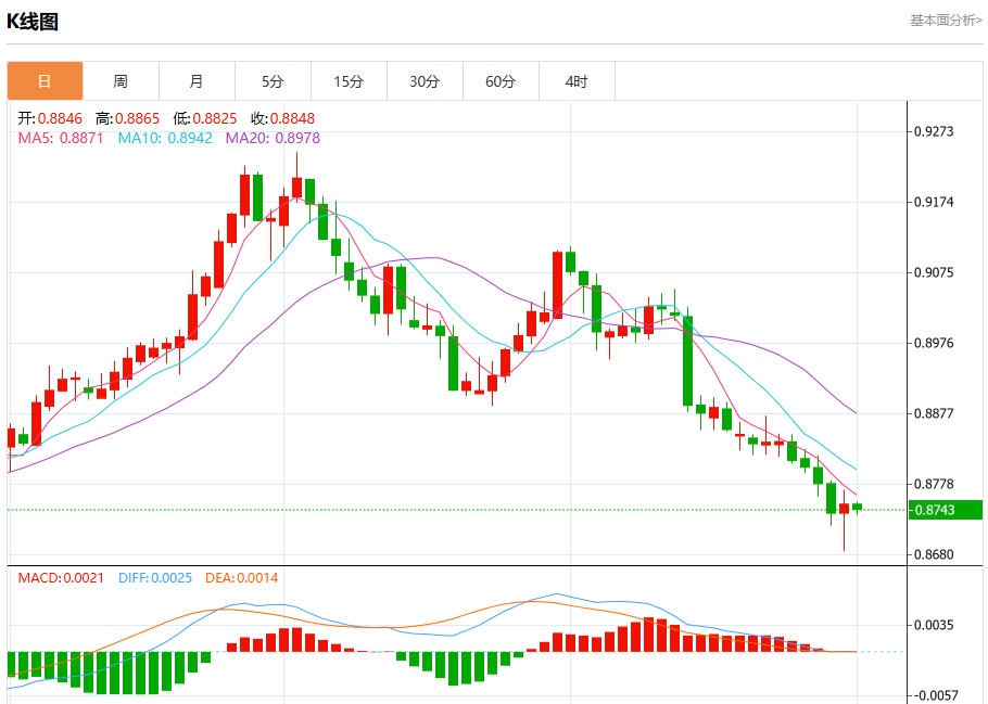 周五盘中,美元/瑞元报0.8744,跌幅0.07%。 今日分析:在0.8715之上,看涨,目标价位为0.8765,然后为0.8785。 技术点评:RI技术指标呈现继续上升趋势。 支撑位:0.88000.87850.8765 阻力位:0.87150.87000.8685 (亚汇网编辑:静香)