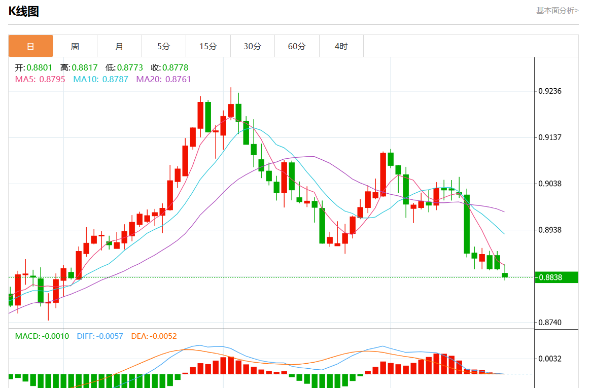 周一盘中,美元/瑞元报0.8839,跌幅0.18%。 今日分析:在0.8865下方做空,目标在0.8825和0.8810。 技术点评:RI缺乏上行动力。 支撑位:0.89000.88800.8865 阻力位:0.88250.88100.8795 (亚汇网编辑:静香)