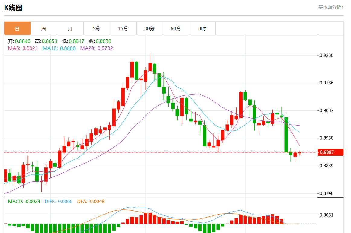 周五盘中,美元/瑞元报0.8888,涨幅0.02%。 今日分析:在0.8855上方做多头,目标在0.8905和0.8930。 技术点评:0.8855的支撑位已经形成,并允许暂时稳定。 支撑位:0.89600.89300.8905 阻力位:0.88550.88300.8800 (亚汇网编辑:静香)