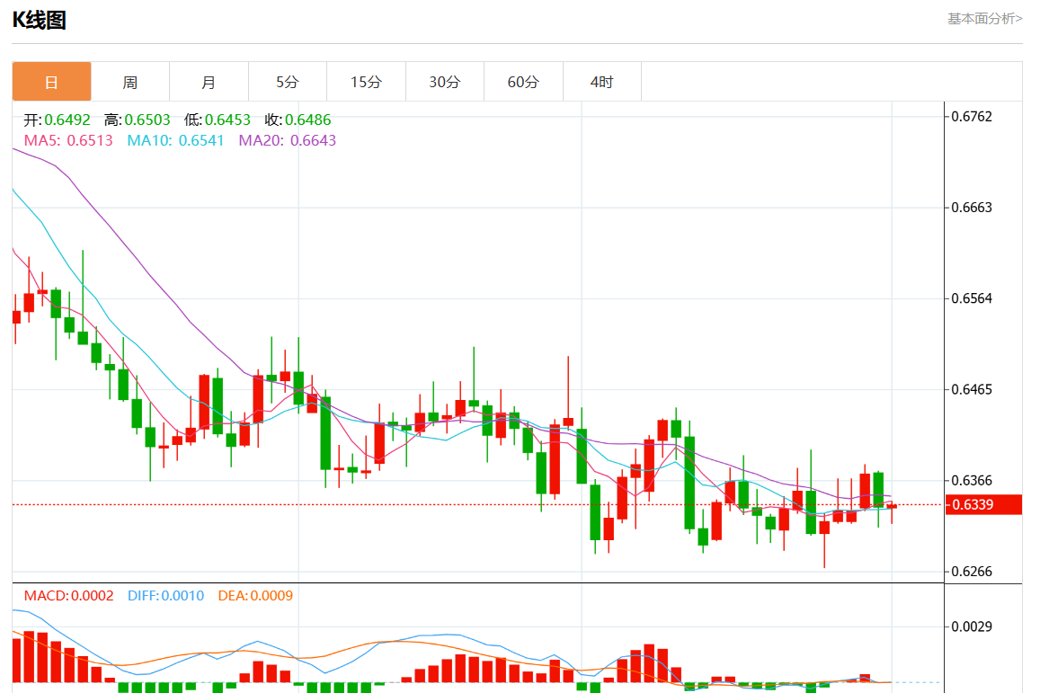 周三盘中,澳元/美元报0.6340,涨幅0.05%。 今日分析:在0.6350下方做空,目标在0.6315和0.6300。 技术点评:上行潜力可能受到阻力位0.6350的限制。 支撑位:0.63800.63650.6350 阻力位:0.63150.63000.6285 (亚汇网编辑:静香)