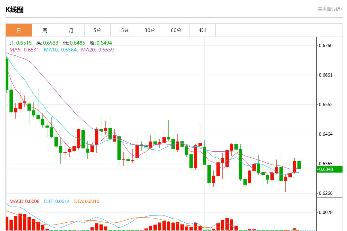 周二盘中,澳元/美元报0.6347,跌幅0.14%。 今日分析:在0.6370下方做空,目标在0.6330和0.6315。 技术点评:RI呼吁新的下行。 支撑位:0.64000.63850.6370 阻力位:0.63300.63150.6300 (亚汇网编辑:静香)