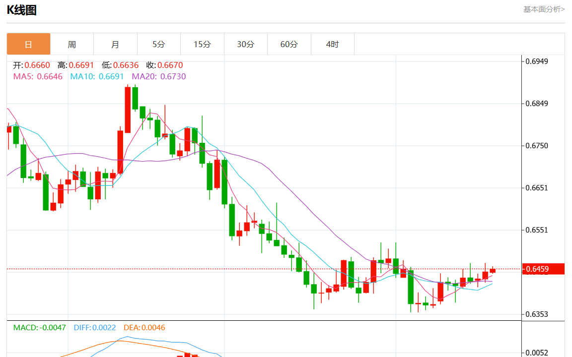 周三盘中,澳元/美元报0.6456,涨幅0.05%。 今日分析:在0.6440上方建立多头头寸,目标在0.6465和0.6475。 技术点评:RI涨跌互现。 支撑位:0.64900.64750.6465 阻力位:0.64400.64250.6410 (亚汇网编辑:静香)