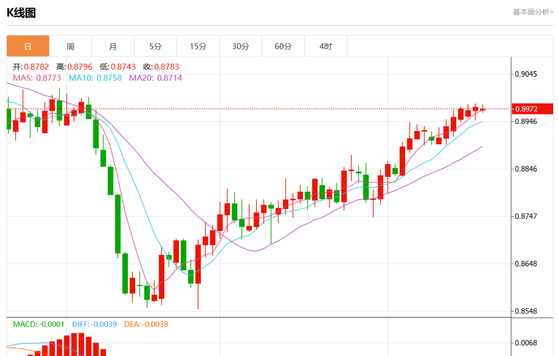 周三盘中,美元/瑞元报0.8983,涨幅0.07%。 今日分析:在0.8960上方建立多头头寸,目标在0.8985和0.9000延伸。 技术点评:RI显示出上行势头。 支撑位:0.90150.90000.8985 阻力位:0.89600.89450.8930 (亚汇网编辑:静香)