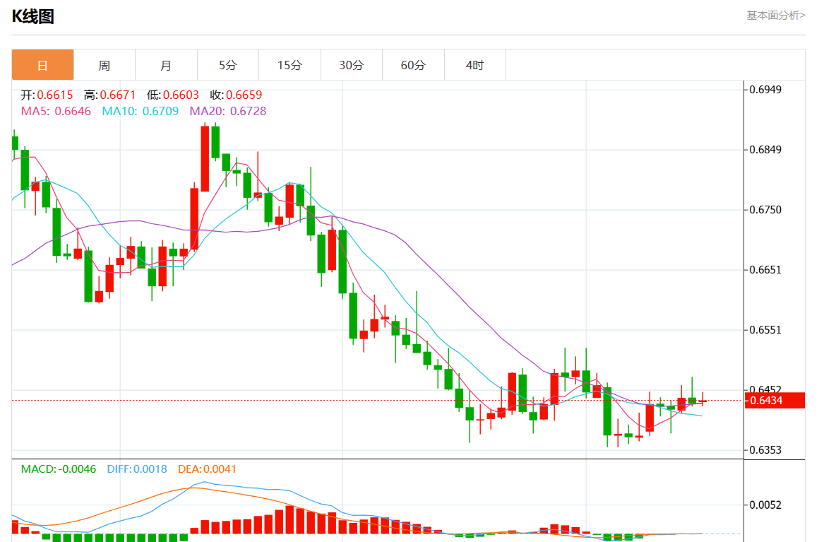 周一盘中,澳元/美元报0.6432,涨幅0.02%。 今日分析:空头头寸低于0.6455,目标在0.6420和0.6410延伸。 技术点评:只要没有突破0.6455的阻力位,跌破0.6420的风险仍然很高。 支撑位:0.64950.64750.6455 阻力位:0.64200.64100.6395 (亚汇网编辑