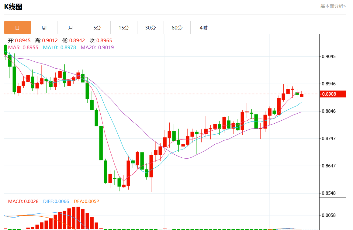 周二盘中,美元/瑞元报0.8908,涨幅0.01%。 今日分析:空头头寸低于0.8920,目标在0.8905和0.8895延伸。 技术点评:跌破0.8905将引发下跌至0.8895。 支撑位:0.89450.89350.8920 阻力位:0.89050.88950.8880