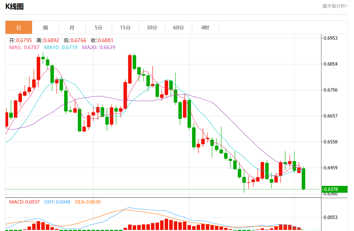 周二盘中,澳元/美元报0.6372,跌幅1.36%。 今日分析:在0.6450下方做空头寸,目标在0.6400和0.6380延伸。 技术点评:RI已突破其30水平。 支撑位:0.64800.64650.6450 阻力位:0.64000.63800.6365