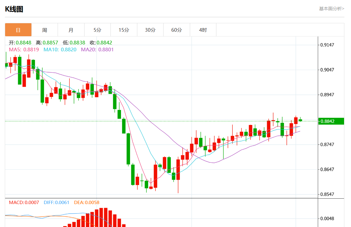 周一盘中,美元/瑞元报0.8839,跌幅0.19%。 今日分析:在0.8835上方建立多头头寸,目标在0.8870和0.8890。 技术点评:盘中技术指标喜忧参半,需要谨慎对待。 支撑位:0.89100.88900.8870 阻力位:0.88350.88150.8795
