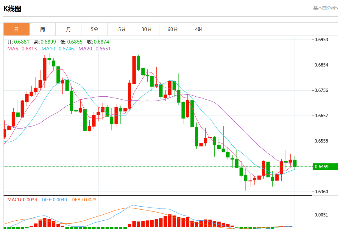 周五盘中,澳元/美元报0.6463,跌幅0.32%。 今日分析:空头头寸低于0.6495,目标在0.6450和0.6425延伸。 技术点评:RI涨跌互现。 支撑位:0.65400.65200.6495 阻力位:0.64500.64250.6400