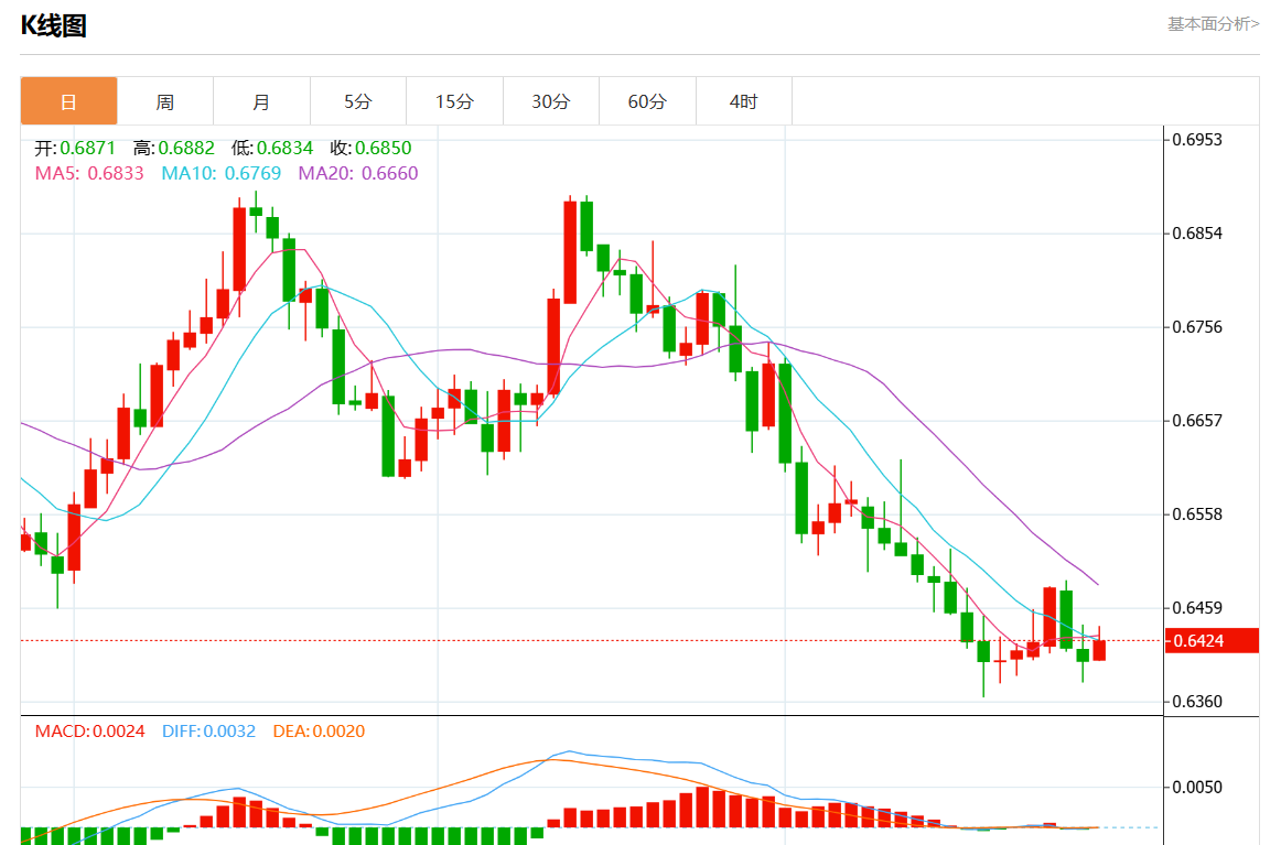 周一盘中,澳元/美元报0.6416,涨幅0.20%。 今日分析:在0.6400上方建立多头头寸,目标在0.6445和0.6465延伸。 技术点评:RI显示出上行势头。 支撑位:0.64850.64650.6445 阻力位:0.64000.63800.6360