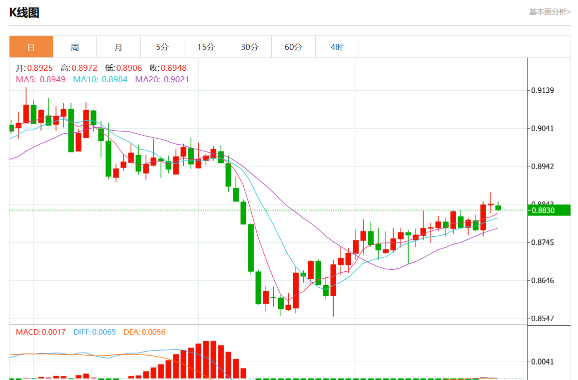 周一盘中,美元/瑞元报0.88626,跌幅0.21%。 今日分析:空头头寸低于0.8860,目标在0.8820和0.8805延伸。 技术点评:RI显示出下行势头。 支撑位:0.88900.88750.8860 阻力位:0.88200.88050.8790