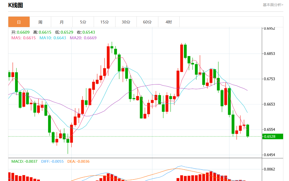 周二盘中,澳元/美元报0.6525,跌幅0.73%。 今日分析:空头头寸低于0.6570,目标在0.6530和0.6515延伸。 技术点评:只要没有突破0.6570的阻力位,跌破0.6530的风险仍然很高。 支撑位:0.66050.65850.6570 阻力位:0.65300.65150.6500