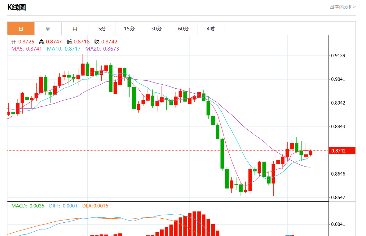 周二盘中,美元/瑞元报0.8747,涨幅0.23%。 今日分析:空头头寸低于0.8755,目标在0.8720和0.8710。 技术点评:只要0.8755是阻力位,就寻找带有看跌偏见的波动价格走势。 支撑位:0.87850.87700.8755 阻力位:0.87200.87100.8695