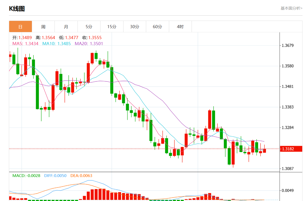 周三盘中,美元/加元报1.3192,涨幅0.16%。 今日分析:在1.3385之下,看跌,目标价位为1.3060,然后为1.2950。 技术点评:RI技术指标运行趋势复杂,倾向于下跌。 支撑位:1.36501.34901.3385 阻力位:1.30601.29501.2730