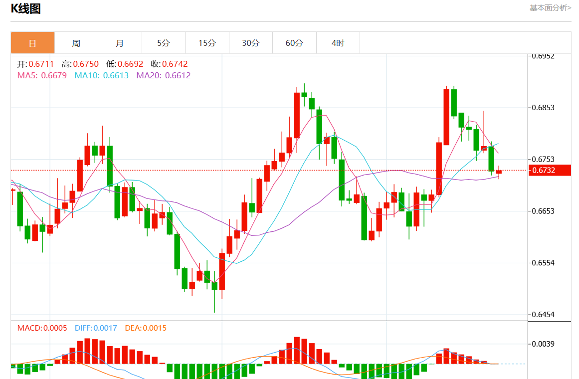 周一盘中,澳元/美元报0.6737,涨幅0.09%。 今日分析:空头头寸低于0.6750,目标在0.6710和0.6690延伸。 技术点评:上行潜力可能会受到阻力位0.6750的限制。 支撑位:0.67850.67700.6750 阻力位:0.67100.66900.6670