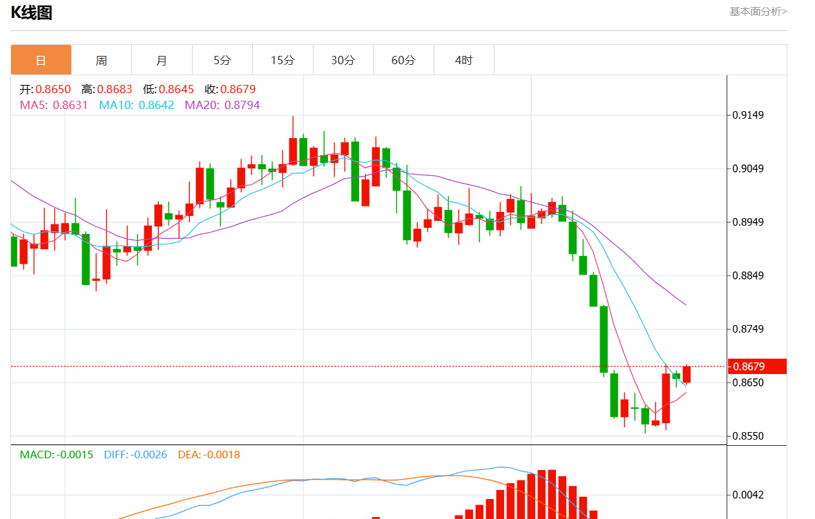 周一盘中,美元/瑞郎报0.8674,涨幅0.18%。 今日分析:在0.8640上方建立多头头寸,目标在0.8680和0.8695。 技术点评:RI与看涨偏见混合在一起。 支撑位:0.87100.86950.8680 阻力位:0.86400.86250.8610