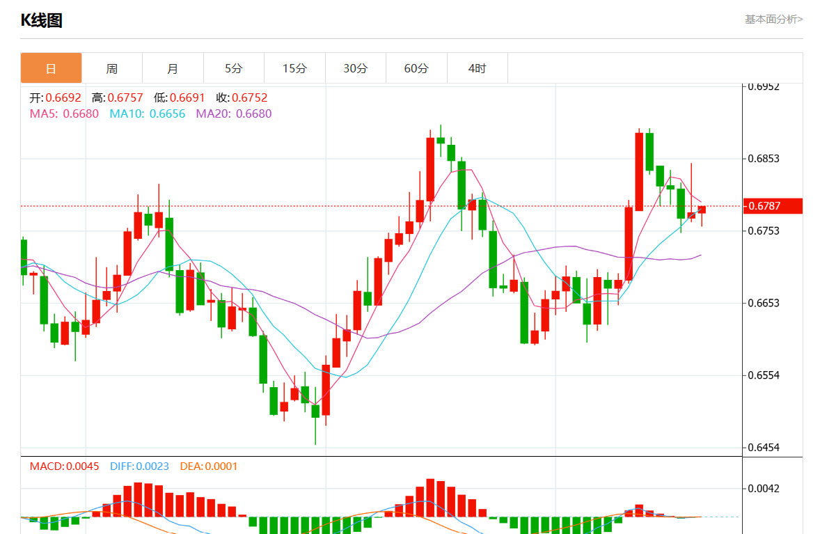 周五盘中,澳元/美元报0.6784,涨幅0.09%。 今日分析:空头头寸低于0.6800,目标在0.6750和0.6730延伸。 技术点评:只要0.6800是阻力位,就寻找带有看跌偏见的波动价格走势。 支撑位:0.68400.68200.6800 阻力位:0.67500.67300.6710