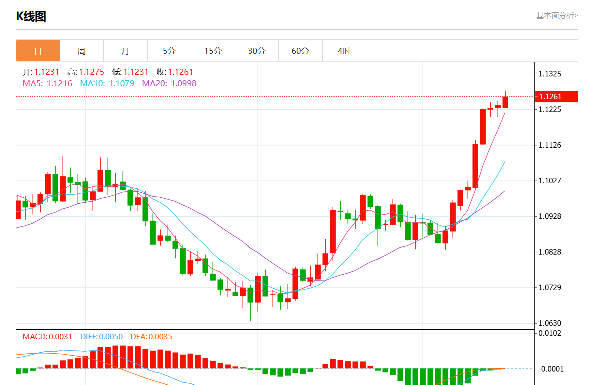 周二欧市盘中盘中,欧元/美元最新报1.1261,日图涨0.21% 今日分析:在1.1230上方建立多头头寸,目标在1.1280和1.1300 技术点评:RI显示出上行势头。 支撑位:1.13251.13001.1280 阻力位:1.12301.12151.1200