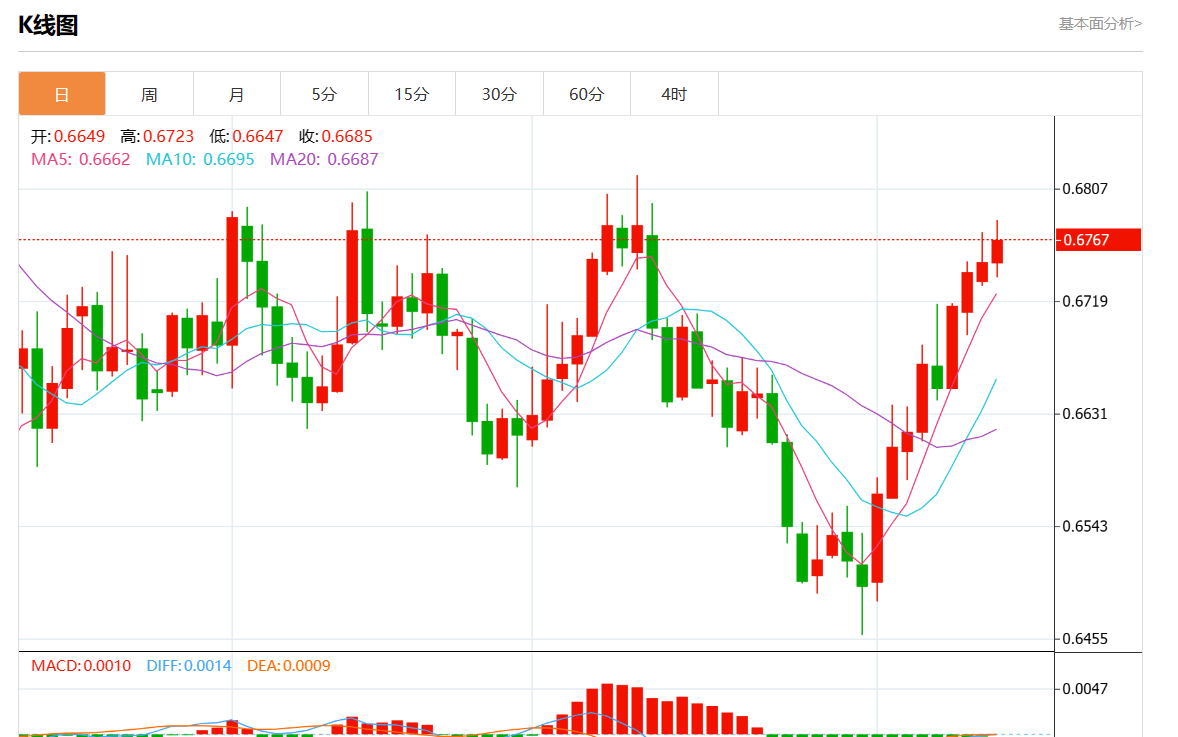 周二盘中,澳元/美元最新报0.6766,日图涨0.24% 今日分析:在0.6735之上,看涨,目标价位为0.6785,然后为0.6800。 技术点评:RI技术指标向上运行。 支撑位:0.68200.68000.6785 阻力位:0.67350.67150.6700