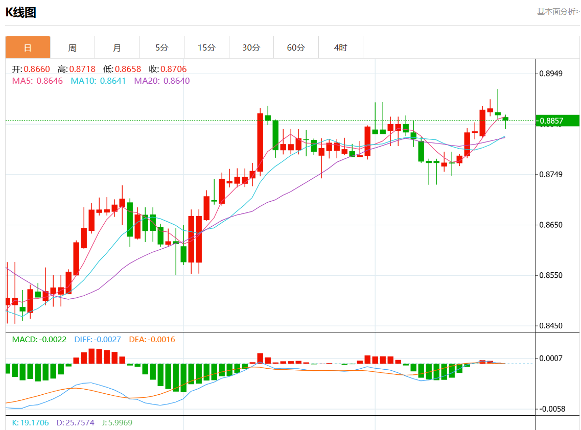 周四盘中,美元/瑞元报0.8855,跌幅0.15%。 今日分析:在0.8870之下,看跌,目标价位为0.8820,然后为0.8800。 技术点评:只要0.8870阻力位不被突破,向下跌破0.8820位置的风险很高。 支撑位:0.89150.88950.8870 阻力位:0.88200.88000.8780 (亚