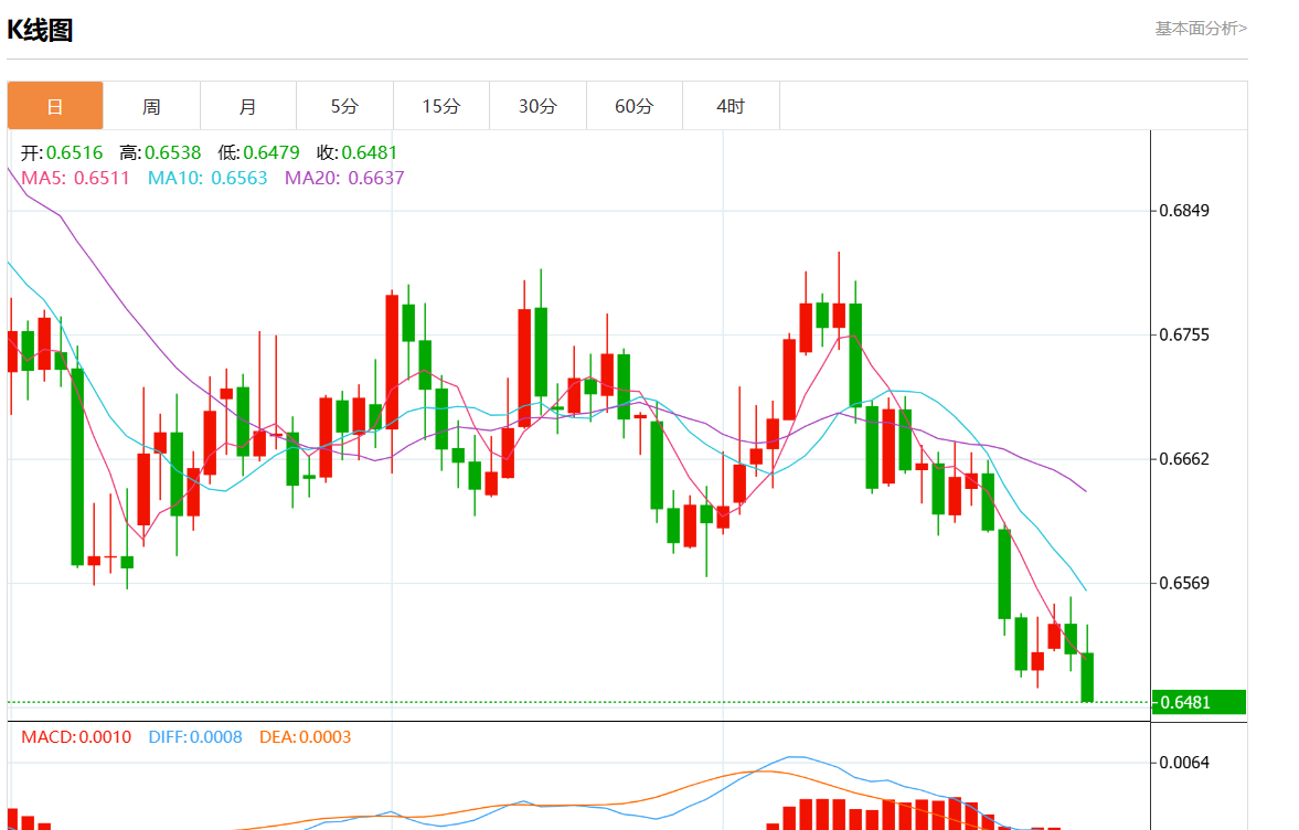 周三盘中,澳元/美元最新报0.6485,日图跌0.47% 今日分析:在0.6530之下,看跌,目标价位为0.6470,然后为0.6450。 技术点评:RI技术指标向下运行。 支撑位:0.65600.65450.6530 阻力位:0.64700.64500.6430