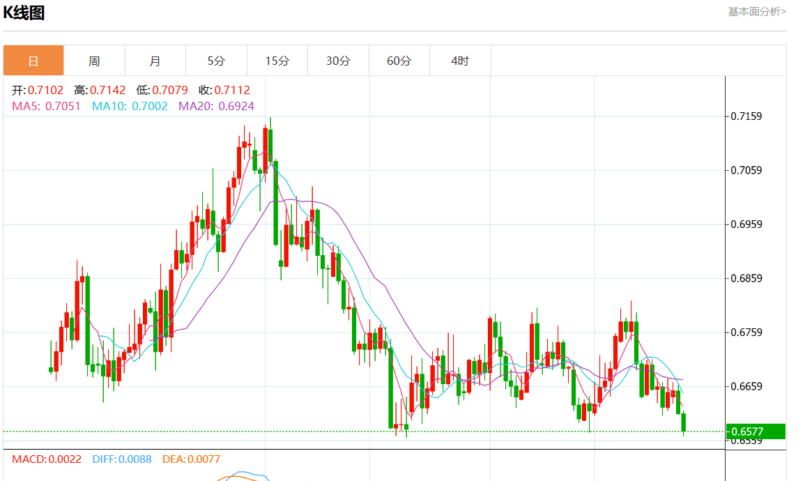 周三盘中,澳元/美元最新报0.6576,日图跌0.51% 今日分析:在0.6800之下,看跌,目标价位为0.6560,然后为0.6420。 技术点评:RI技术指标向下运行。 支撑位:0.70300.69200.6800 阻力位:0.65600.64200.6270